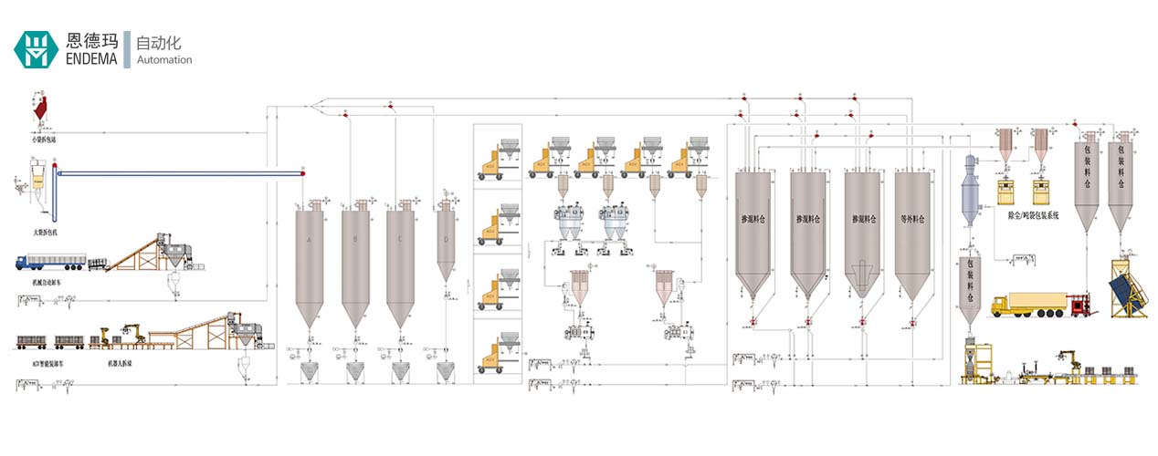 恩德玛的典型产品为自动集中供料系统(又称为自动供料系统、集中供料系统),粉粒体自动计量配混(自动配混系统、自动称重计量系统),气力输送系统(包括正压输送系统、负压输送系统、浓相气力输送、稀相气力输送),粉体自动上料系统等。